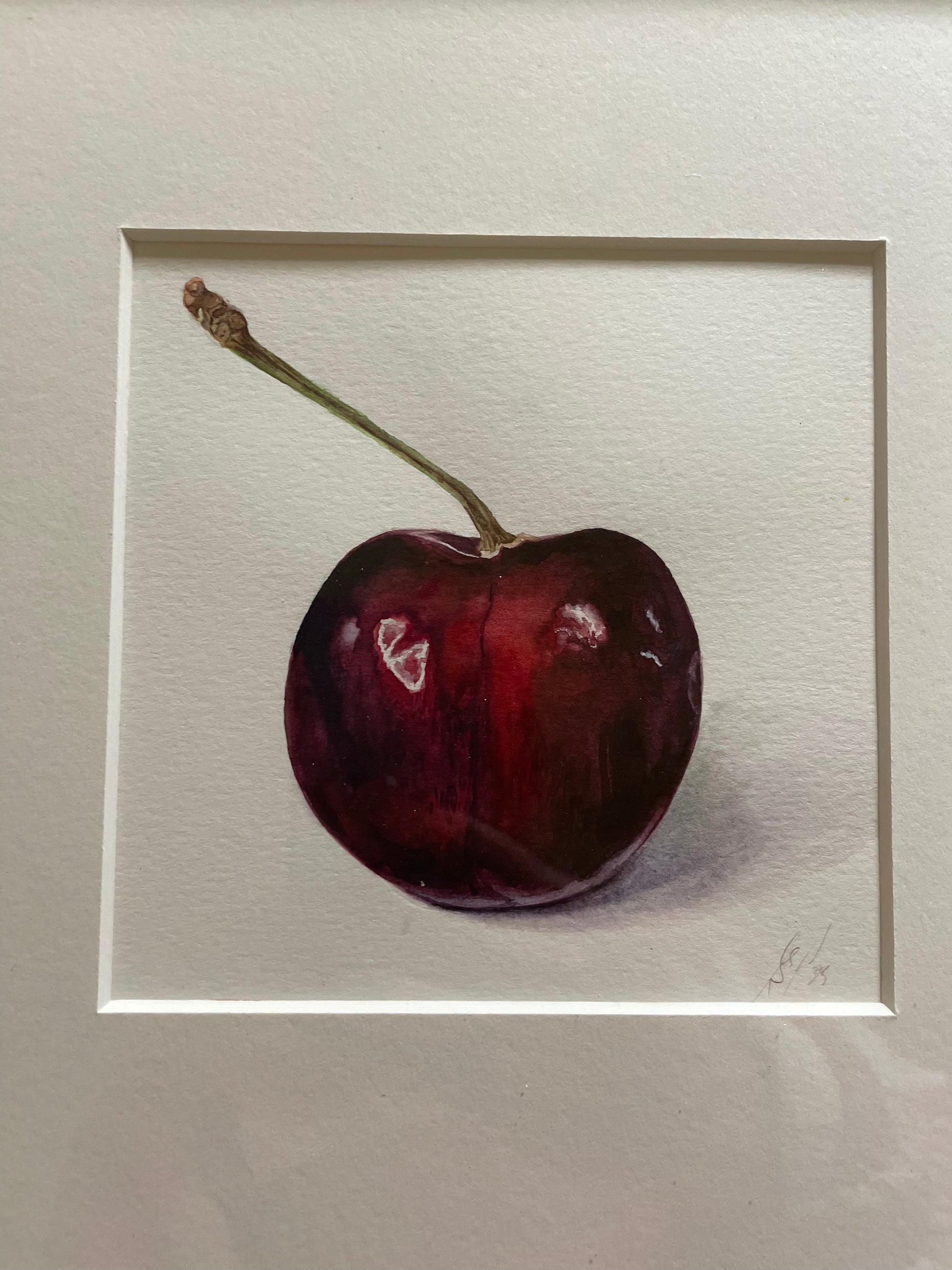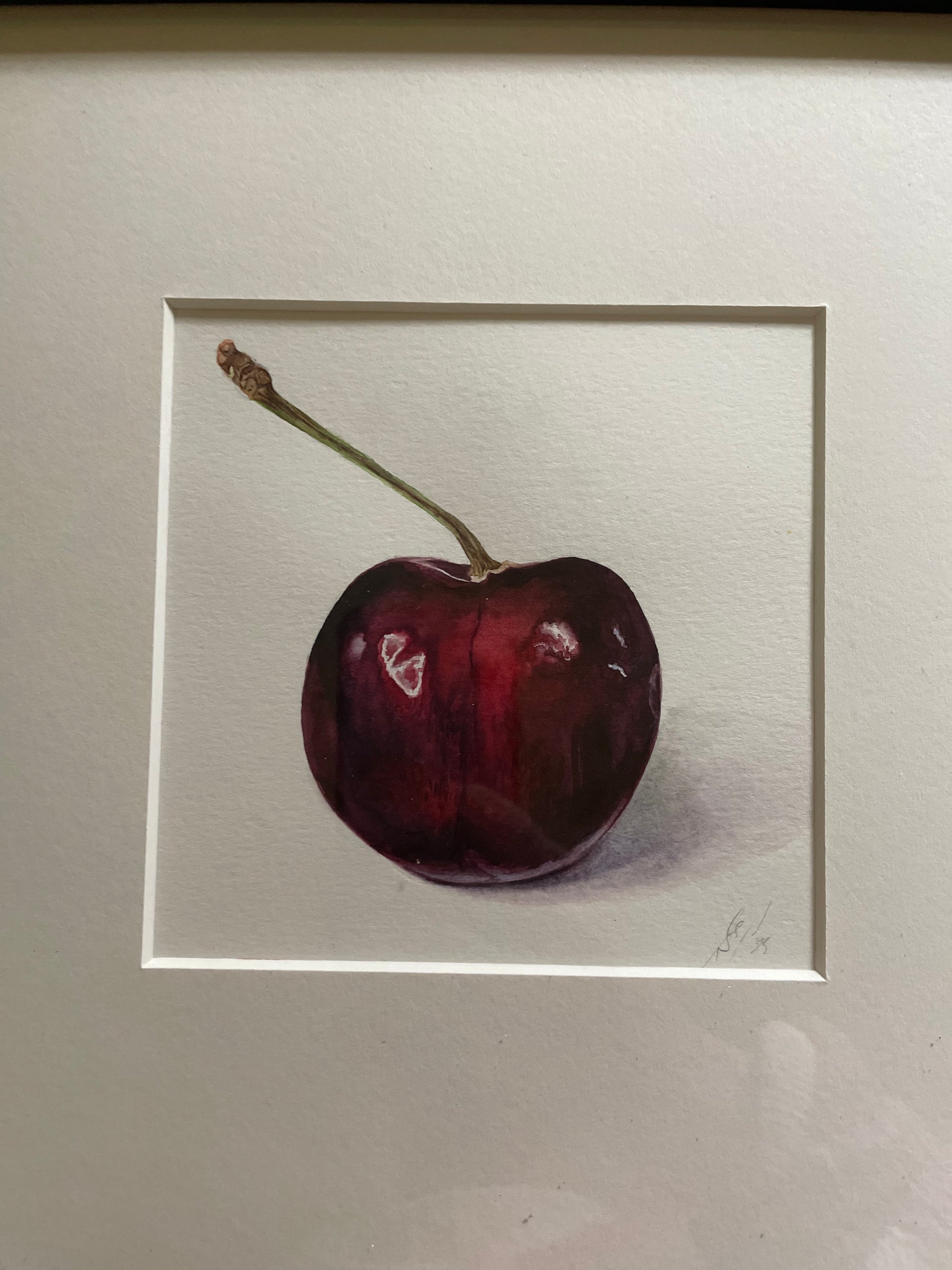Original watercolour painting. Only one available.Shiny, juicy Red Cherry in Watercolour mounted and framed. White mount with black frame. Size 28cmx28 cm x2cm deep Ready to hang on the wall.